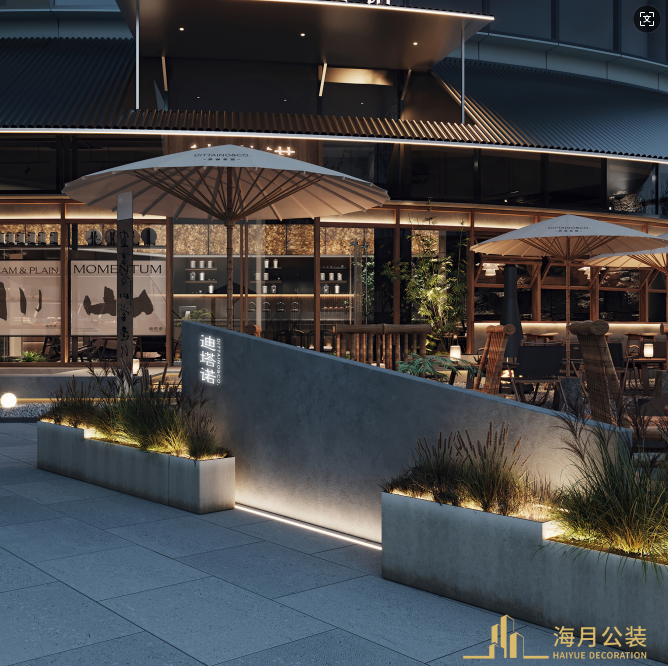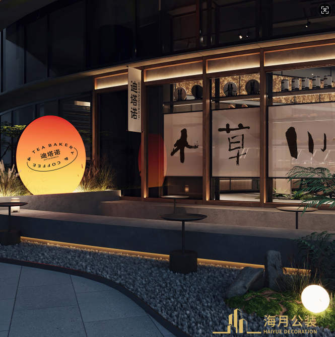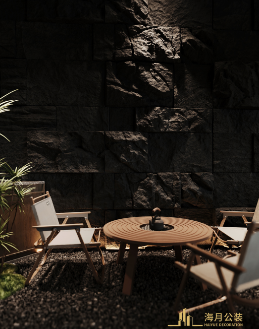 棕色带动温暖的氛围在空间中流淌,给人安心而舒适的感觉。不同深浅的灰色,取自山石,沉稳而不张扬,中和棕色的暖调,赋予这个商业空间宁静而平和的力量,抚平浮躁的心绪。石材与木质是空间的主要材质,以不同的形态打造丰富的空间层次。石材的冷酷与坚硬,对比木质的温暖与柔和,是理性和感性的碰撞,刚柔并济,为都市人创造贴近自然的生活情趣。整体风格设计围绕自然意趣的中式美学。错落的水泥矮墙,形似层叠的山峦,配合创意书法展示架,奠定了整个商业空间的风雅基调。再走近,门头是波浪板和旧时木立柱结构,呈现现代场景下的中式文化韵味。在外摆区,粗犷的自然元素遍布其间,提供多样化的落座选择,茶桌、靠窗吧台、下沉卡座,呼吸自然、感知户外,每一处都有独属于自己风景。店内延续了山野自然与中式风雅的格调,是温暖与宁静、粗砺与精致、自然与人造的和谐共融。收银制作区和陈列区皆以沉稳的木围绕周边,中间区域则利用踏石、碎石、挂轴、绿植,串联起空间内的落座区域,而不同的组合,让每一处都有其独特的韵味。独赏、共享,寻求生活之雅。你可以选择与二三好友围炉煮茶,也可以点上一杯咖啡、一份西点独坐于窗边,还可以静坐于地台,点茶、赏词、闲聊。人和景,终将转化为一份温润的情感,慢慢渗透进空间的每个角落。
