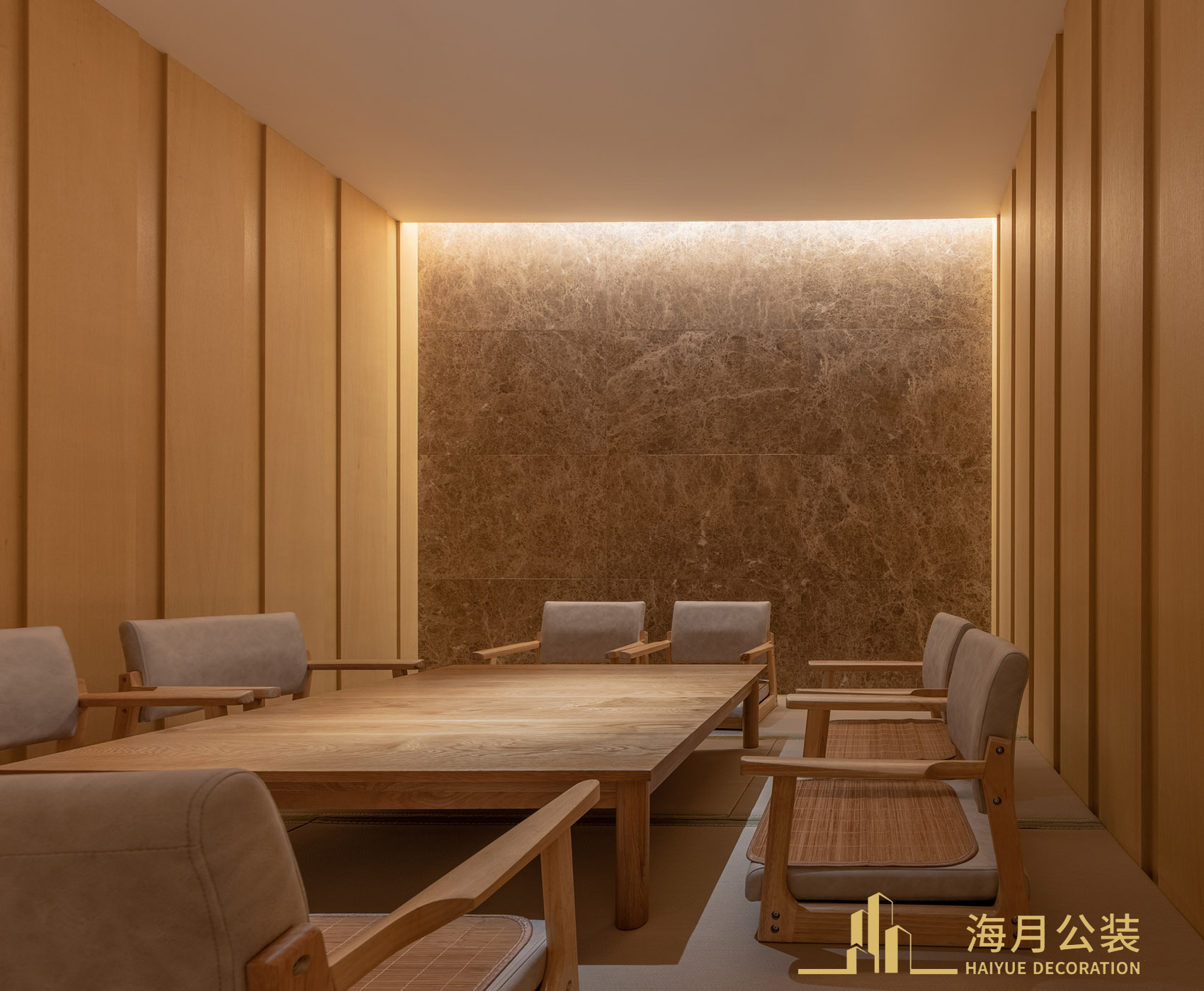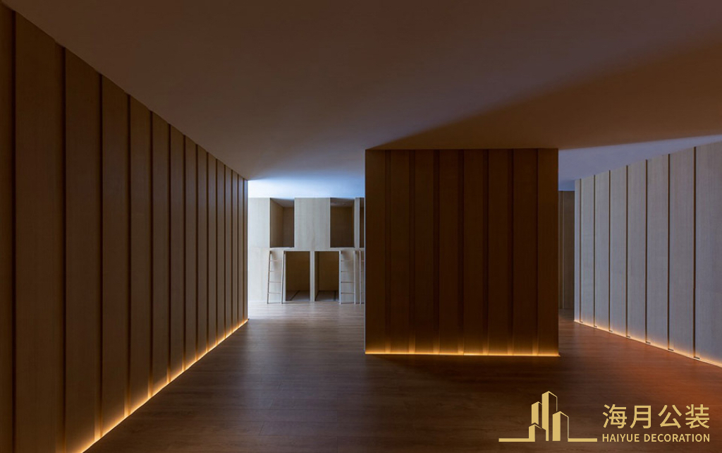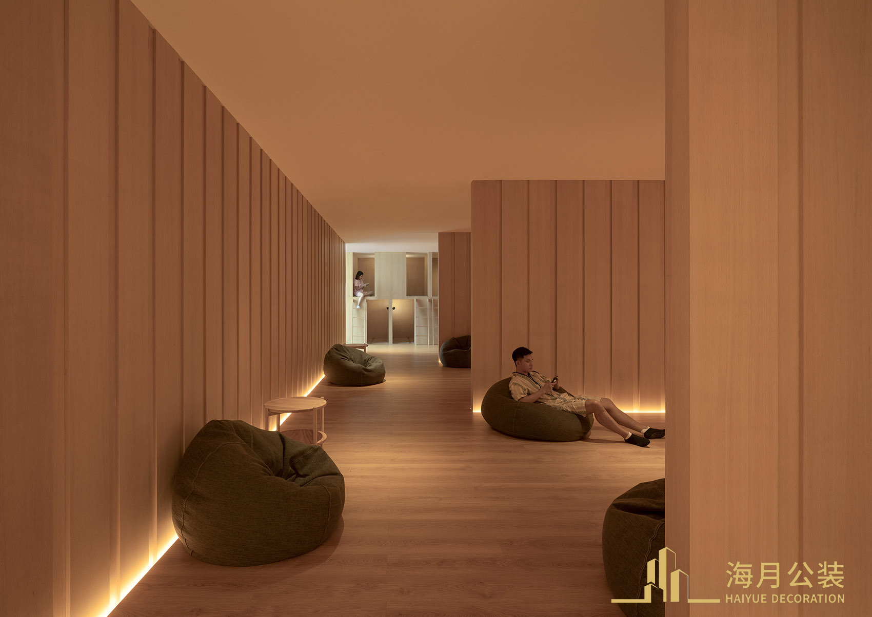 汤崎空间,位于深圳福田区,距福田口岸出口仅 300 米,步行距离仅需五分钟。占港城华庭裙楼五层,共 30000 平方米,含泡汤、按摩、理疗、餐饮、休憩和娱乐等功能。从 2021 年开始陆续转型,进行空间改造,成为新式汤泉生活的代表,演绎典型的城市生活缩影。水疗中心作为特殊的空间载体,在福田口岸附近迅速蔓延,步行 15 分钟可达的范围就有十来家。起初,这些水疗按摩空间主要供两岸频繁经济往来的商务人士休闲娱乐,随着两岸通关更加简易,不少港人也选择周末北上,在深圳泡汤、按摩、放松,缓解上班的疲惫。2021 年转型之后的第一年,来自香港的顾客就为汤崎贡献了 50%的营业额。转型的要点是从“商务接待”向“放松休闲”的气质发展,重新整合,让商业空间从封闭走向流动,让视觉从硬性走向柔性,期待整个“娱乐城”在日常的空间里容纳非日常的叙事。女宾区的天花与地面,白色悬顶,黑色沉底,将视觉重心降低在视平线以下,行走其间,层峦叠嶂下的水面波纹,蜿蜒如溪流,清漪柔和平静,过去的富丽堂皇终于退居消隐。相同底色的载体由于光色不同而呈现不一样的状态,同样的光线在不同底色材质上也有不同表达,空间和光互相作为对方的载体。在懒人沙发区,由 240mm 宽的黄橡木间隔排布,构成凹凸木饰面,底部灯带 2400K 的光从地面向上浸染,与橡木墙面奠定了空间中光与色的基调,塑造转型后温馨放松的空间性格特征,局部以壁龛的形式嵌入蒸汽壁炉,缓缓上升的雾气也是动态的光的载体,与墙面底部的灯光浑然一体,交相辉映,诉说着这片小世界独有的光的物语。