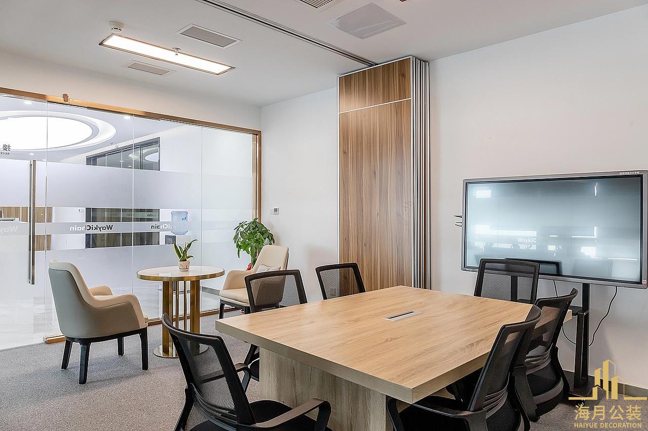 材质与色彩的选择上,工装设计兼顾了“耐用性”与“科技感”:地面通铺高密度灰色方块地毯,耐磨损且吸音,适配物流企业频繁的文件搬运与设备移动;墙面以白色哑光抗菌板材为主,搭配局部浅木纹饰面板,中和了工业感的冷硬;前台背景墙采用弧形石膏板 +嵌入式 LED灯带,配合“Waykichain”品牌标识的立体字,既强化了企业形象,又通过流线型设计弱化了传统物流办公的厚重感。细节处,会议室的折叠门选用木纹饰面+金属边框,既保证了隔音效果,又能在大型会议时完全敞开,拓展空间利用率。