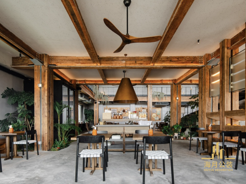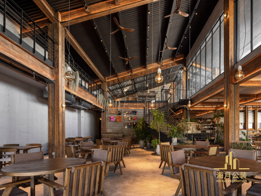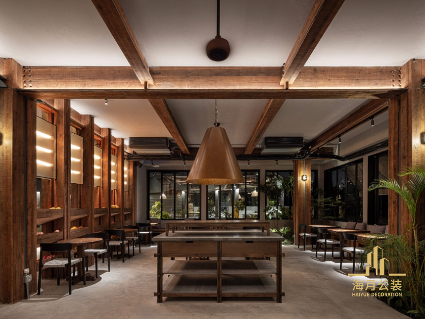 场地原本的梁、柱,由回收的老木板所覆盖,整体构建出线条的秩序感,老木板的颜色、肌理,经过时间沉淀,令人与农场木屋产生天然地联想,铺垫出田园叙事的基调。同时,黑色钢板材质的门窗、楼梯扶手、护栏,呈现出锻造的工业技艺,空间部分墙面装有软木板,并将带有品牌元素的创意布艺、植物叶片、草帽等元素固定其上,与空间摆放的新鲜面包、食材、舒展的植物,共同营造出农场生活“自给自足”的手作温度。这样一来,多元材质与天然物料的相互碰撞,展现了农场餐厅的丰富性与趣味性,可持续的装修设计的理念也得到诠释。