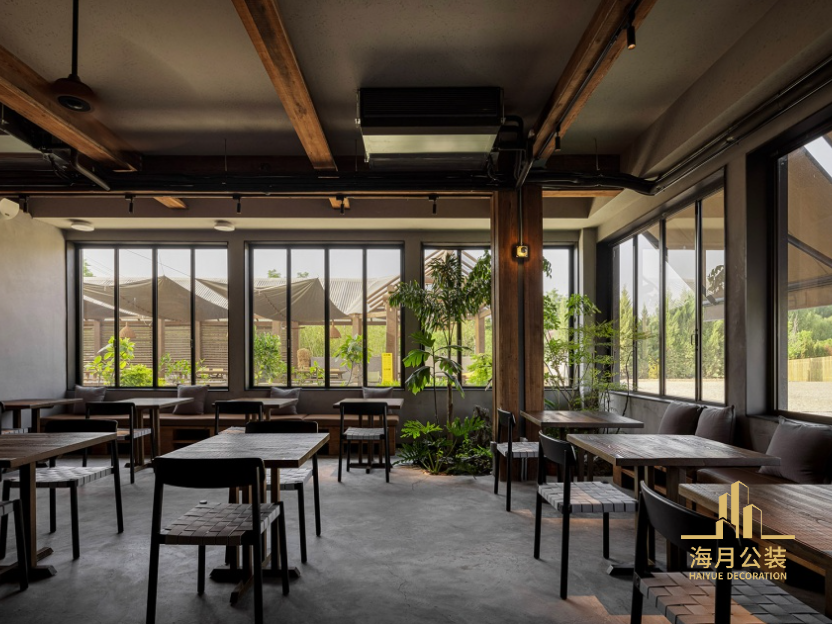 项目外立面使用了土黄色的真石漆,呼应田野大地的肌理和粗犷感,主入口以横长的木质折叠门引入开放视野,释放空间的烟火场景。步入室内,灰色涂料处理的墙面保留了斑驳的工业痕迹,与部分立面使用的加气块砖,产生质地的差异,丰富立面层次。