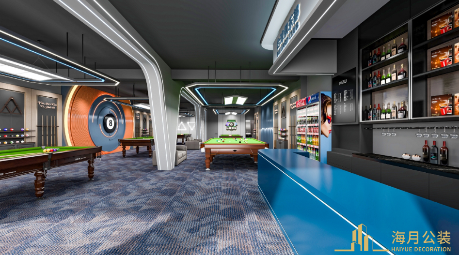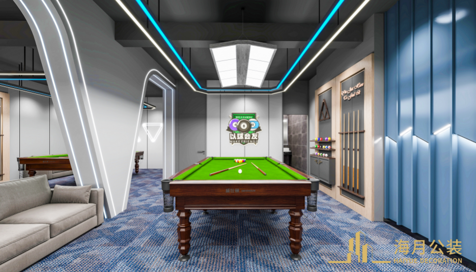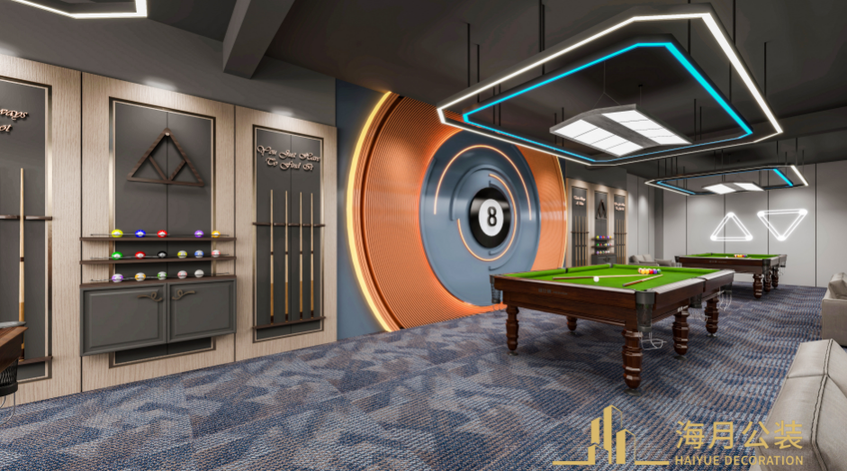 顶部灯具采用线性设计,光线均匀分布,既提供充足照明满足台球运动对光线清晰度的要求,又通过灯光的造型增强空间的现代感与科技感 。重点照明突出背景墙和台球桌,营造出主次分明的光影效果。