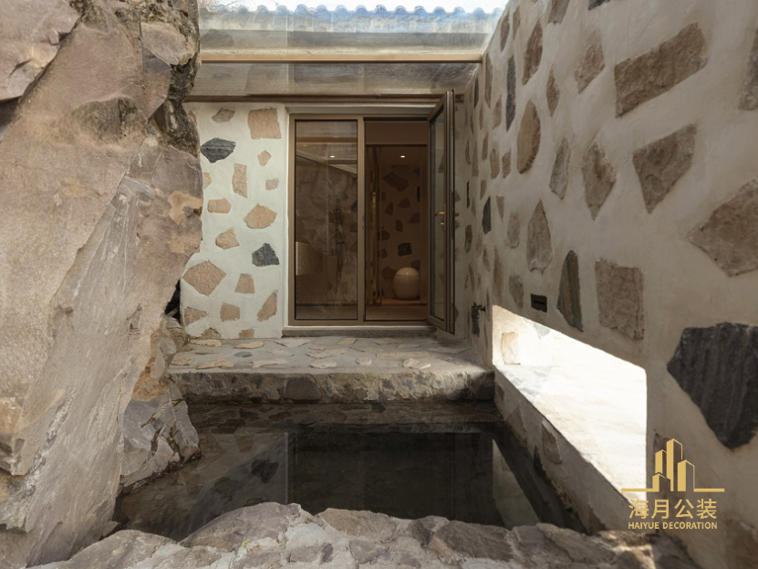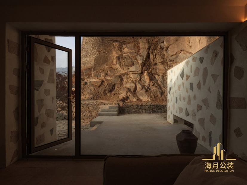为强化建筑与山的关系,我们选择以石材铺贴建筑体块。远观时,白盒子整体悬浮于山前;近察时,则可见石头每一片精心的排布,其颜色、比例、角度,皆经过设计师驻场与师傅精心推敲完成。没有采用传统砌石填缝的工法,而是将石材干挂于墙面,因石材厚薄不一,填缝材料在表面自然形成微妙的曲面过渡,野趣中透出一丝灵动。最终装修设计呈现出如牛轧糖般的质感,这种感觉有一点惊喜,是设计过程中未曾预料的。