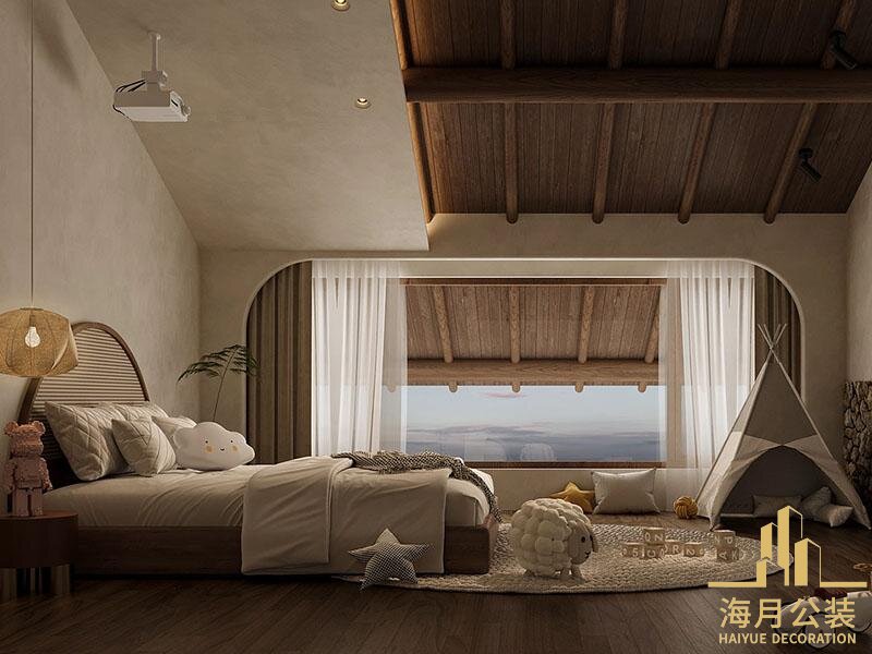 民宿设计的另一重考量。起冒空间甲,洗索台,收纳柜与小型办公区巧妙整合,在有限空间内实现功能晨大化;卫浴间乐用干界分高设计,嵌入式收纳搭配澡前灯,柜内灯的氛围蔷造,既解决了收纳痛点,又提开了使用舒适度,餐厅的高顶木质梁架搭配大落地亩,不仅引入充足自然光线,更将童外暴观纳入童内,扶形壁察的点规则为用餐空回增添了几分雅致。即便是儿童房与复式卧室这类个性化空间,设计师也能在坚守性察风基调的基础上,融入童基元素与應假感设施,让空回法配不同居者的需求。
