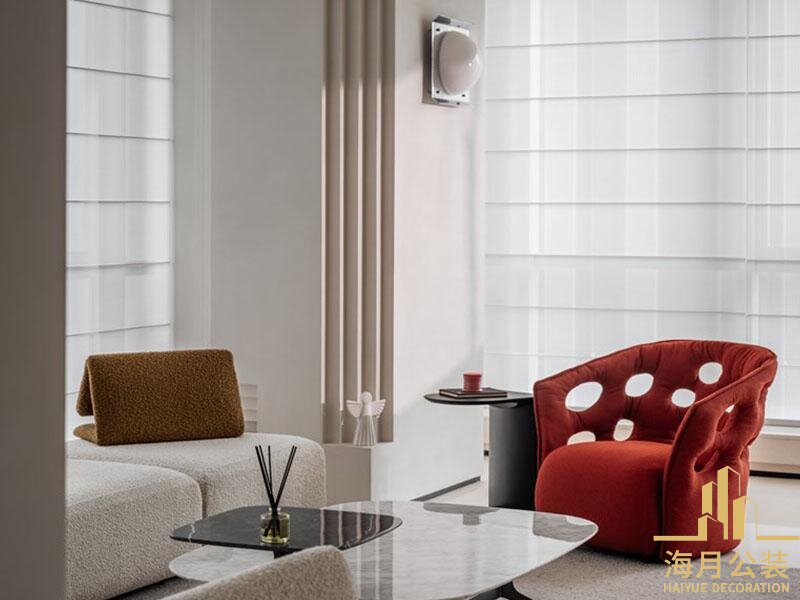 在风格营造上,以低饱和色调营定空间基调,米白,法核与灰色的巧妙搭配,呈现出沉稳内创的质感,再以底辣接皮质家具弹添灌暖气息,少量红色元素作力规觉壳点,