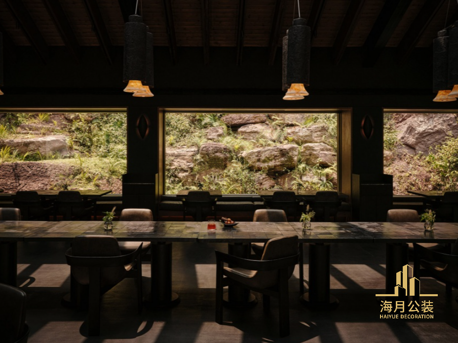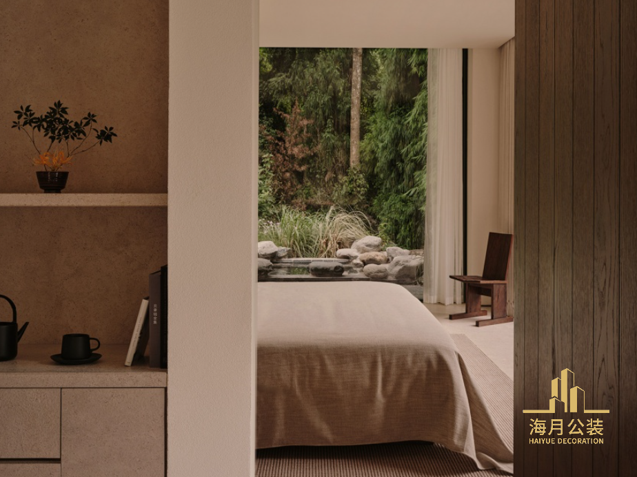 入口接待空间手工凿刻的混凝土立面,粗粝而真实的触感赋予建筑一种恒久质感。凿刻出的肌理表面,在光影下显露层次,从抵达的第一刻便传递出空间的真实与永恒。中央庭院是酒店的社交核心,一个向外延展的空间,在群山背景下让自然与建筑交汇。庭院中央矗立着一株古老的桢楠树,四周水池环绕。作为山谷中最古老、最高大的树木,它宛如无声的守护者,将体验锚定于历史与现代的延续之中。精神空间的大面积落地窗消融了室内外边界,在装修设计中将自然景观引入室内。人与森林在此展开沉浸式对话,在静谧与开阔的氛围中,感受周遭自然的律动。