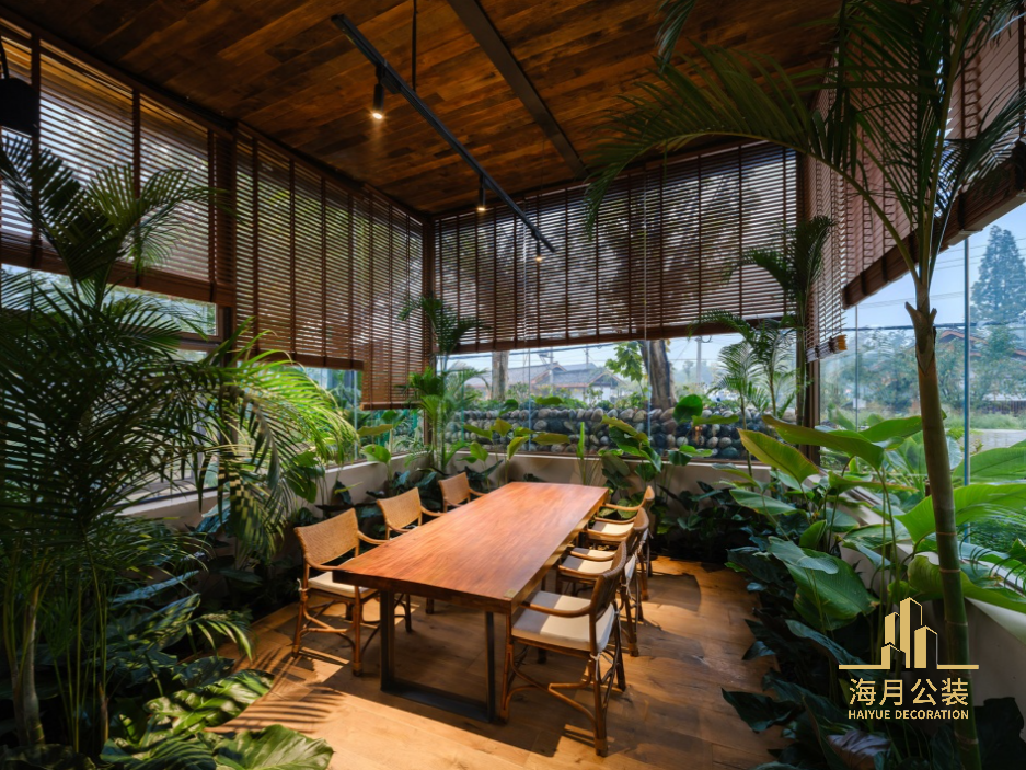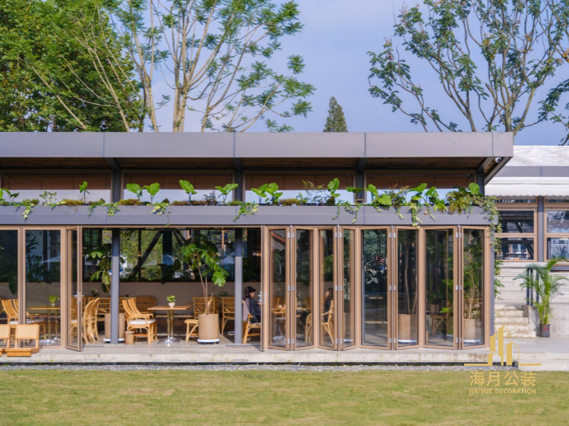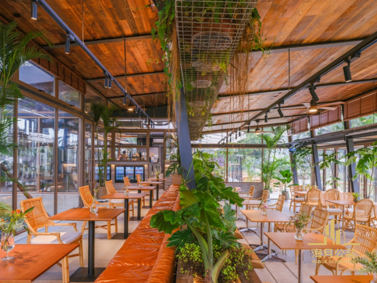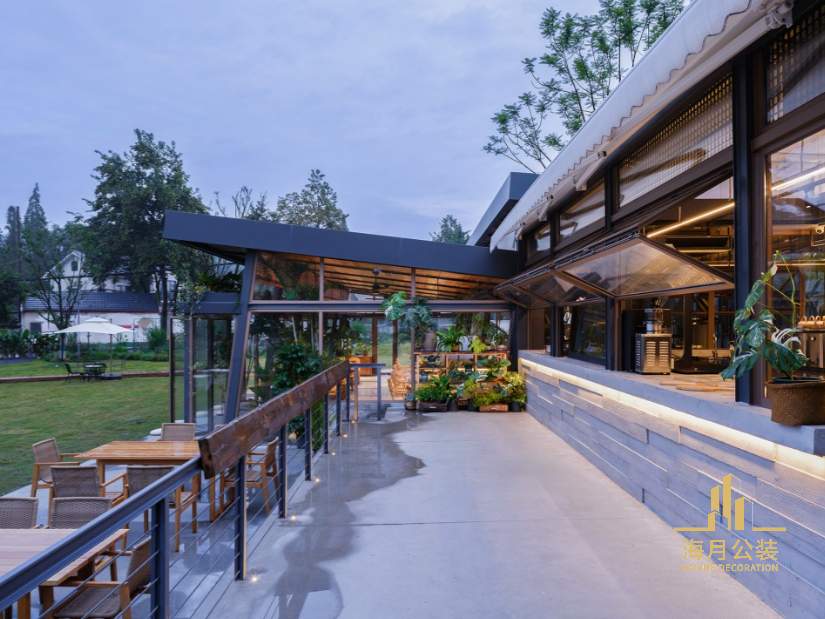 场地原有的1.2米高差通过三级台地消化,最低处成为休憩座面。斜柱体系延续至室内,单坡屋顶顺应地形起伏,屋顶形式呼应地形的层层跌落,采用单坡屋面,在保证3.2米舒适净高的同时,营造出富有节奏的空间序列。以中央吧台与庭院为界,两侧的单坡屋顶呈V形,不仅组织了排水,更将整个建筑的“势能”引向核心的吧台区域。立面以大面积玻璃为主,装修设计中最大化餐厅的通透性与开放性。为了达到极致的轻薄屋顶观感,所有暖通设备均被预埋于地面之下。在深灰色钢结构与混凝土的基调上,室内大量运用温暖的老木、藤编与实木家具,灵感源自老成都的竹编椅,重塑本地休闲记忆。天花与踢脚线统一采用株木,幕墙铝窗框也选用同色系。