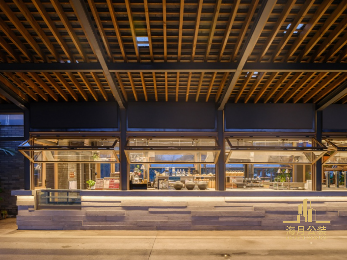 为塑造一个轻盈、通透的“棚棚儿”,建筑主体采用钢结构。棚儿下的钢柱顺势倾斜,与棚儿顶扬起的钢梁呈90度角衔接,轻盈而坚定地“扎根”于站台之上,展现出力与美的平衡。半室外棚棚儿布置瓦片的檩条系统被直接暴露,形成独特的顶部视觉。透明瓦与石板瓦随机穿插,白天阳光渗下,光斑点点;夜晚地上预埋的极小地埋灯透出点点亮光,如星光洒地,日夜浪漫交替。