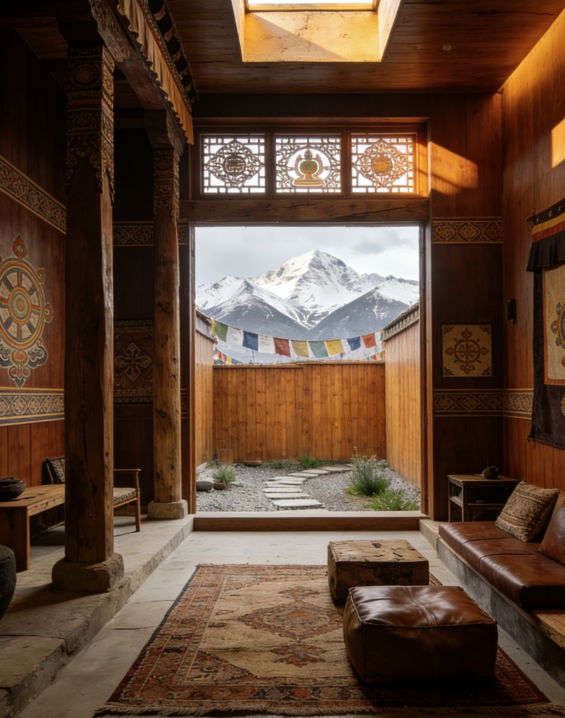 设计以“藏韵留白,简约栖居”为核心,在保留藏式文化底蕴的基础上,摒弃繁复装饰,适配现代民宿的舒适需求与审美趋势。设计弱化传统藏式元素的堆砌感,剔除经幡等过于浓烈的符号化装饰,通过材质、色彩与线条的精准把控,将藏式的质朴肌理与现代简约的留白美学相融合,打造出兼具文化辨识度与居住舒适度的私密空间,让宾客在静谧中感受藏式风情的内敛韵味。