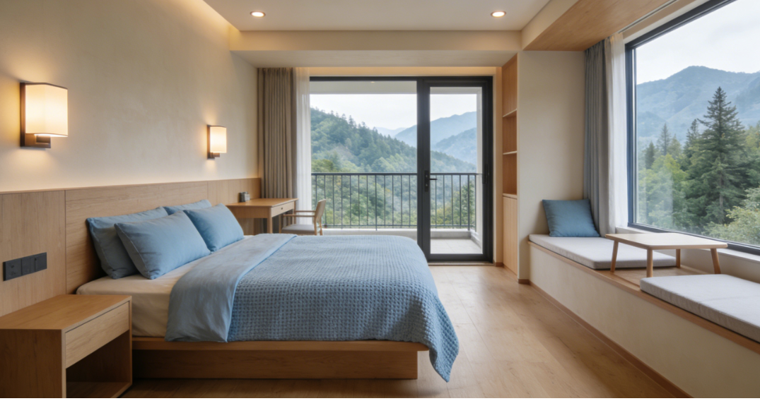 客房区选址于场地静谧地带,远离核心动线,保障宾客休息的私密性与安静性。采用低容积率布局,建筑以多层为主,搭配错落有致的景观庭院,每间客房均配备独立观景阳台或私人泡池(高端户型),实现“推窗见景、入户享泉”的体验。客房内部采用“极简舒适”的布局,睡眠区为核心,搭配休闲沙发、书桌、mini吧等功能区域,动线流畅不拥挤;空间划分摒弃硬性隔断,通过软装、家具自然分区,最大化保留通透感,让宾客在客房内也能感受自然与温泉的融合。