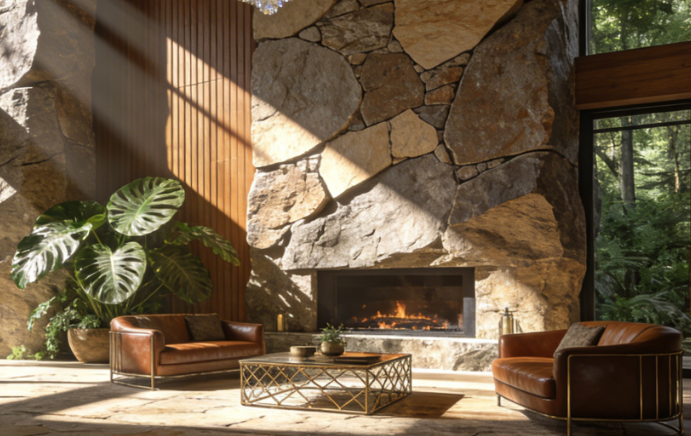质感与氛围的精准拿捏是设计的另一核心亮点。室内以自然肌理为基底,岩石元素的巧妙运用呼应野奢主题,搭配错落有致的原生绿植,让空间自带自然气息;地面铺设的质感地毯,不仅中和了岩石的冷硬,更提升了空间的温暖触感与奢华感。同时,设计师深谙光影的叙事力量,借助落地窗引入的自然天光,与室内材质相互映衬,光线流转间,纱帘的轻柔、岩石的厚重、绿植的鲜活交织成景,让空间兼具野性张力与温柔质感。