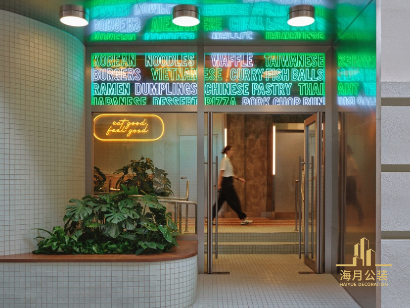 通过外立面的现代装修设计元素,人们被自然地引入食集。青绿色瓷砖构成的弧形体量延伸至室内,搭配绿植和鲜艳的霓虹灯招牌。食集分为两层,提供即食餐饮和公共就餐区,汇集中式、葡式、日式、泰式和台式等多种菜系。新的装修设计采用工业材质基调,材料语言简洁质朴:镀锌钢板、金属网、瓷砖和混凝土砖,这些常见于街区巷道...