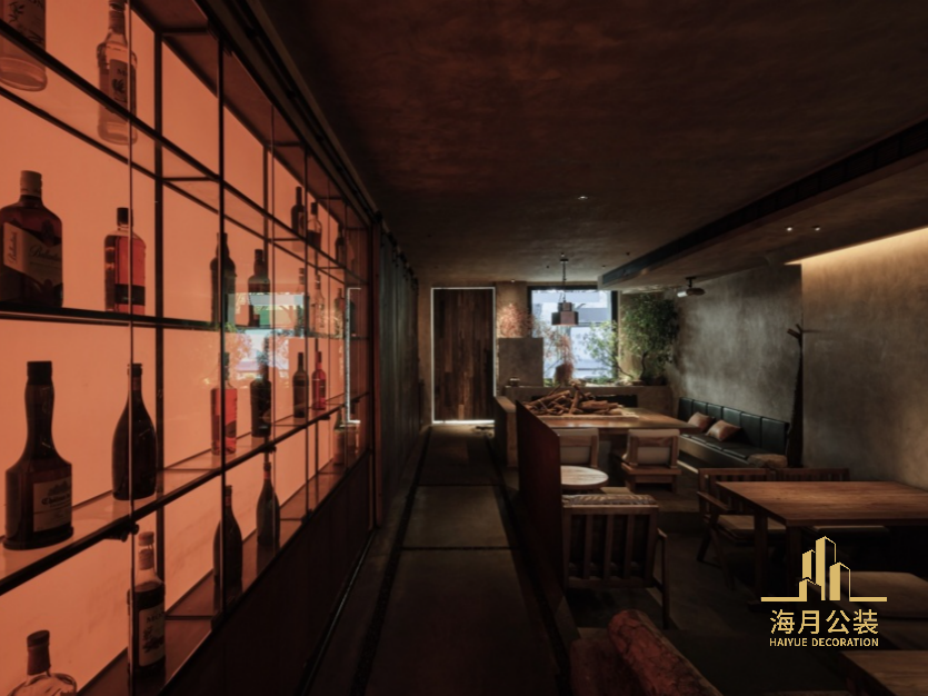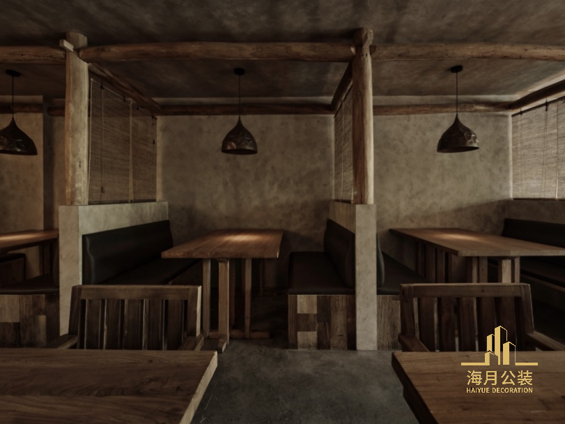 业主是个开餐厅新手,但胆气豪迈,就像他主打的融合菜品一样,整个店铺腔调也要敢融,融中融西,融古融旧,融糙融雅,但无论如何,要与门前的月湖园林气质符配。以为装修设计打算在整体粗糙的基础上,用自然界常见的元素与材质渐渐点缀相融。耐候钢,山石,老木头等,这些金石草木,便是用来营造空间的主要材料。餐厅的正餐部分与茶水吧区域虽然在空间设计中没用明确的划分,但基本上也是将一楼前厅区作为一个日茶夜酒的Bar空间。我们回到甲方的老家山村,开着货车,去了一个废弃采石场,拾取了一车石块,锯了些松枝香樟,布置在店里,提供自然的木材香气。过年回老家发现荒废着的老宅,门楣上的镇宅画像很适合放在店里做装饰,顺便又去了附近的农贸市场买了些瓜果作为摆件。