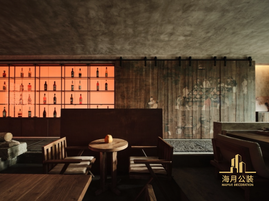 一楼既然以茶酒为主,考虑复合周边月湖与天一阁的风雅格调。我想起北宋赵佶《文会图》里描绘文士们围坐大桌宴饮畅谈的场景。恰巧本案室内,建筑可以下挖,结合错落地台,有可以席地而坐,也有布置矮凳,刚好也能形成一个围坐场景,与墙面老木板移门上的画面内容相呼应。考虑到茶饮散客为主,所以在装修设计中把山上锯来的木材堆在大桌子之中,邻座对面为陌生人时,可以隔绝部分视线。