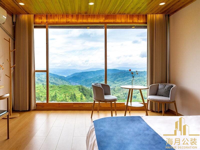 民宿设计则是"开放"与"沉浸"的平衡。长桌铺着蓝白相间的蜡染布,配着圈椅围坐成热闹的聚落,抬头便是用麻绳与灯泡串起的吊灯,粗犷里藏着温柔的光;旁边的沙发区摆着吉他,大窗户把梯田的绿意裹进来,连空气里都浸着松弛的烟火气。在这里,"装修"从不是对空间的改造,而而是让建筑与自然,传统与现代对话杉木的暖,白墙的净,窗景的绿,还有藏在细节里的民族质感,都成了"壹西格玛"的语言:它不刻意复刻传统,也不盲目堆砌现代,只是让每一处设计都长在土地里,让住进这里的人,既能枕着杉木香入睡,也能伴着山景醒来,在现代舒适与在地烟火的交织里,找到度假最本真的松弛。