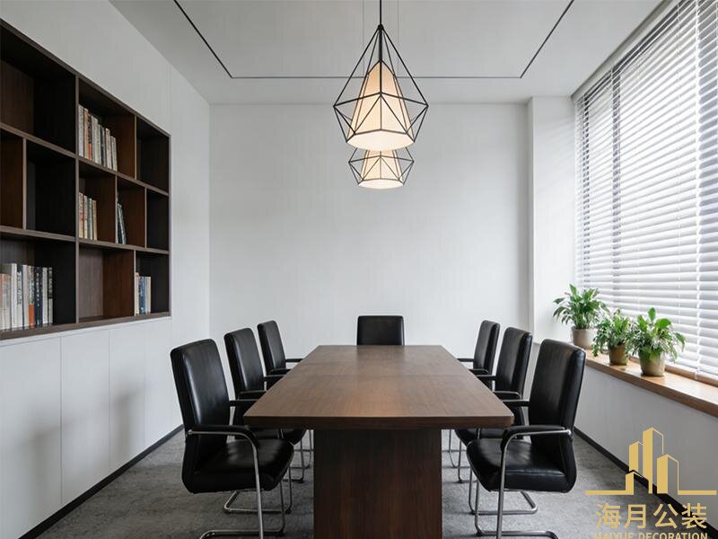 会议室以功能优先为设计核心,配置长条形实木会议桌保障全员面对面高效沟通,何造型吊灯强化了空间的现代感与聚焦感。细节设计上,采用百叶窗可灵活调节光线,避免屏幕反光影响会议效率,嵌入式书柜的设计不仅展示了企业专业形象,也方更存放各类会议资料,适配10人以内的部门会议与客户洽谈场景,营造出高效专业的沟通氛围。休闲水吧区则成为空间的"活力缓冲带",设计初衷在于打破纯粹办公的紧感,为员工提供放松社交的专属空间。浅灰色布艺沙发与原木茶几的搭配营造出温馨的居家感,木质台面与白色橱柜组成的水吧满足了员工简餐,茶饮的日常需求。这片空间的隐性价值在于,非正式交流往往能激发创新灵感,成为提升员工幸福感的重要载体。