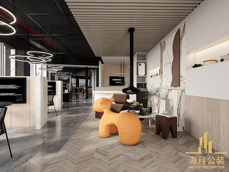 从空间规划到细节打磨,海月公装始终践行"把空间变成生产力"的初心。前台以极简白与深灰石材撞色,曲线灯带与水波纹吊顶营造高级韵律,高低错落的台面兼顾接待功能与视觉层次,成为企业品牌的第一张名片。开放办公区采用黑根玻璃隔断保障通透,可调节工位隔板兼顾隐私与协作,人体工学座椅与定制软装藏着对员工的细致关怀。休闲与洽谈区则化身松弛感延伸地,人字拼木地板搭配温润软装,壁炉造型装置与环形吊灯相映,既适配头脑风暴与商务洽谈,也能让员工在忙碌中寻得休憩角落。