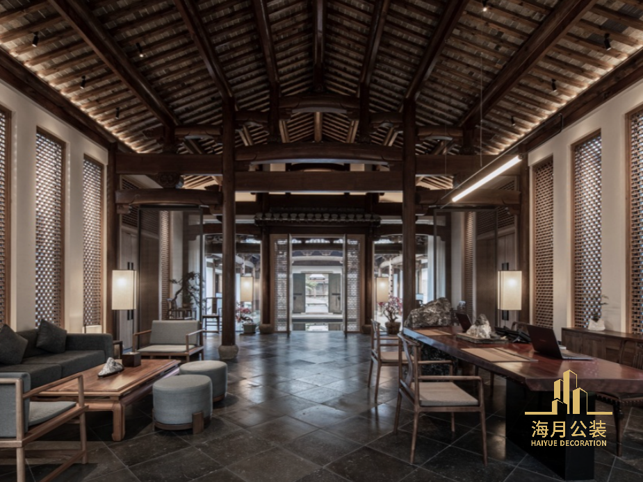 接待厅的装修设计,始于对古建筑风骨的尊重。裸露的抬梁式木构架成为最强有力的语言,构建出殿堂气韵。两侧花格屏风将光线转换为虚实的晕染,营造出层层递进的深邃感。空间器物亦是对自然质感的礼赞,没有浮华雕琢,唯有被时间打磨的朴素之美。