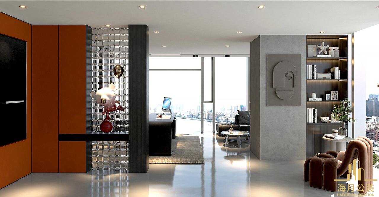 独立办公室采用深色系定制柜体+简约办公桌,搭配艺术装饰画与藏书格,营造沉稳专业的氛围;大面积玻璃隔断既保证空间私密性,又不阻断采光,让管理者在专注办公的同时,能随时感知团队的创意氛围。