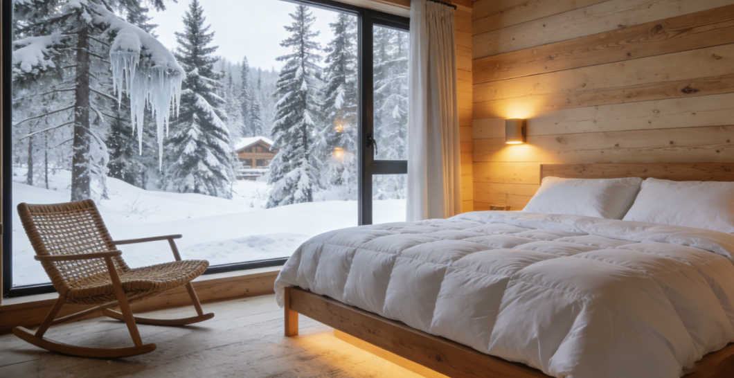 采用开放式大床房格局,以睡眠区为核心,动线简洁流畅,无冗余隔断。全景落地窗占据整面墙体,最大化释放观景视野,实现躺在床上即可直面森林雪景的体验,让自然景观成为空间的核心视觉焦点。