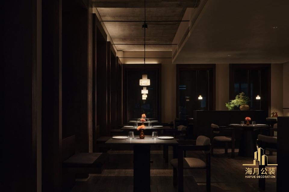 沿窗就餐区的桌椅摆放与每个窗框融为⼀体,窗框既是框景,⼜作为两⼈餐位。同时露出这⽚区的梁底天花,将所有管道⻛⼝等设备收纳于旁边的吊顶中,窗框⾼度与吊顶底部⻬平,两者之间的⾼差为吊灯的⾛线排布留下空间,并与天花脱开⼀定距离,远看灯线隐去,当落座于此⼜可以体验到⼀种⾼顶仪式感。在空间另⼀端的尽头,“锈迹斑驳”的镜⾯呼应空间整体材质调性,映照出对⾯的窗户,延伸强化了空间节奏。
