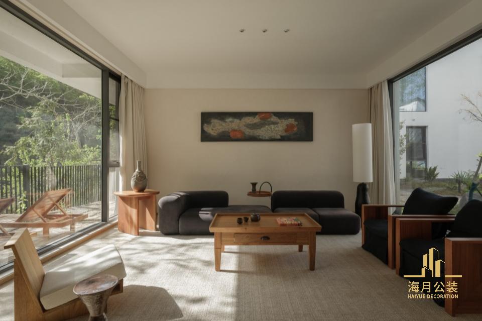 正对吧台咖啡操作区域,我们在装修设计中同样也设置了与操作台面等长的条桌,咖啡师在制作咖啡时可以同顾客进行日常的对话。16m的水平长条形窗创造了电影感的动态画面,自然和日常两种风景每天都在窗前交织浮现。地面铺陈着墨色天然石材,深邃、静谧;顶部是红雪松木,自室内缓缓延伸至外部的檐廊。通过材料与光线的巧妙组织,让人在空间中感受到流动的风景与时间的沉淀。空间的内外墙面,均覆以定制的灰泥。师傅手作批刮的痕迹-被保留,形成了粗糙而丰富的自然肌理。它们以一种谦逊的姿态,与周遭环境融为一体,为整个空间铺陈出朴素而静谧的底色。