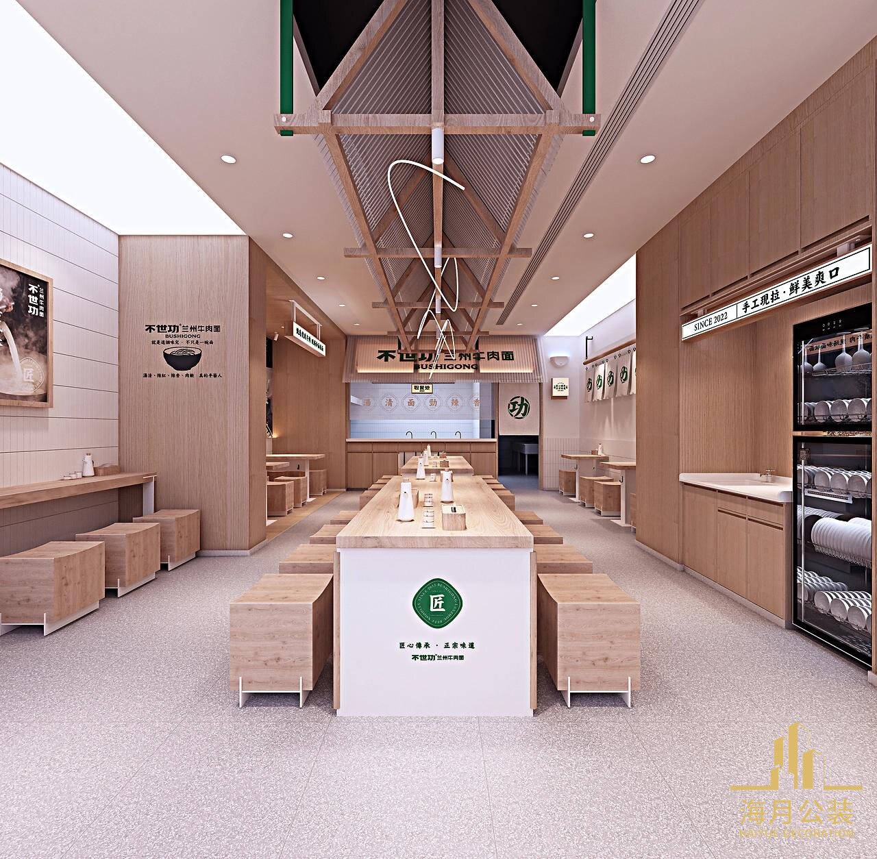 墙面的装饰是餐厅的一大亮点。品牌相关标语以简洁有力的文字传递着餐厅的理念与特色,吸引顾客目光;装饰布帘随风轻摆,增添了几分灵动与诗意。最引人注目的当属展示现擀面的宣传画,它生动地展现了兰州牛肉面手工现做的精湛工艺,让顾客还未品尝,便能感受到面条的筋道与美味,将传统美食的魅力展现得淋漓尽致。