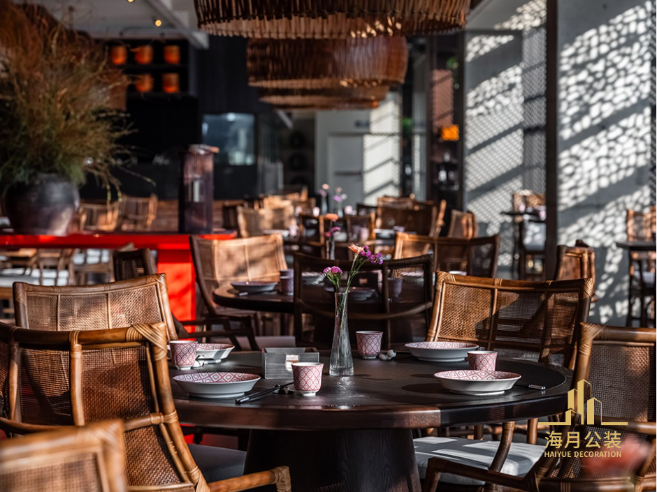 应对狭长结构,在大堂的中段处,老旧的案几柜起到软性分隔区域的作用,重新刷上大红色,有意呼应川菜的热辣,这一抹亮色,犹如川菜中的辣椒,成为点睛之笔。
