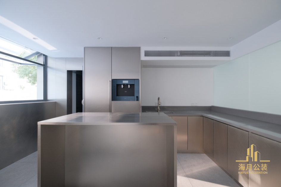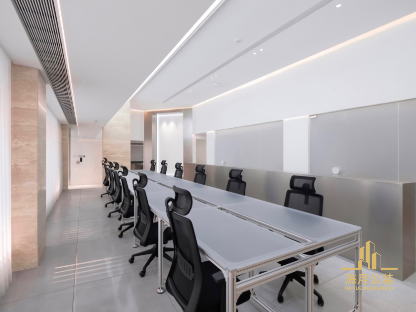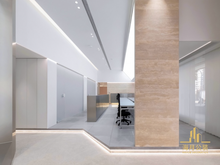 不划分工位,整面落地窗弱化室内外分隔,大片顶面灯光塑造均匀的光线,为主要办公区域塑造最舒适的环境;半高柜和磨砂玻璃保证内侧的二人办公室有良好的间接采光。灯膜向办公桌方向倾斜,隐藏了原空间中低矮的横梁并为办公区域提供均匀灯光。装修设计中采用工业材料不锈钢与自然材料洞石对撞作为主要材料为空间定调,为办公空间注入活力。入口走廊尽头展示墙左侧为茶水间,柜体全部采用不锈钢材质包覆,房间南侧向外开窗,使空间开敞明亮,为茶水间创造轻松愉悦的氛围。