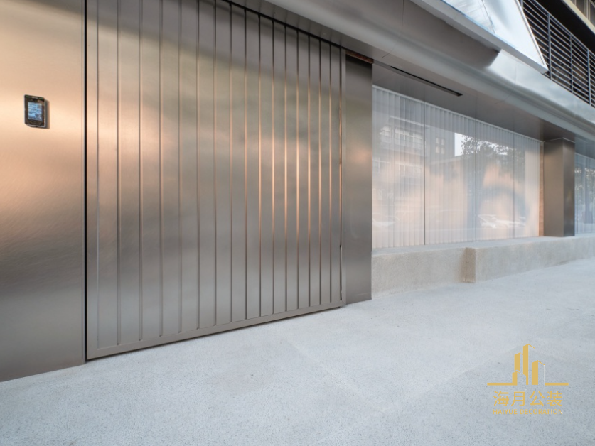 主入口位于场地南侧,只使用矮墙为院墙,保证视线通透,阳光充足。保留场地原有樟树,为进入室内空间增加层次,并硬化院落地面作为活动场地。门头斜顶和茶水间向外折叠窗塑造原始房屋一门一窗的意向,入口采用喷砂不锈钢电动门和玻璃双开门,出檐部分采用不锈钢材质进行弧形包袱。内侧采用无框玻璃门,沿街部分采用不锈钢弧形屋檐与玻璃落地窗搭配为表皮,为室内提供更好的视野与采光,向外展现出工业未来的氛围。