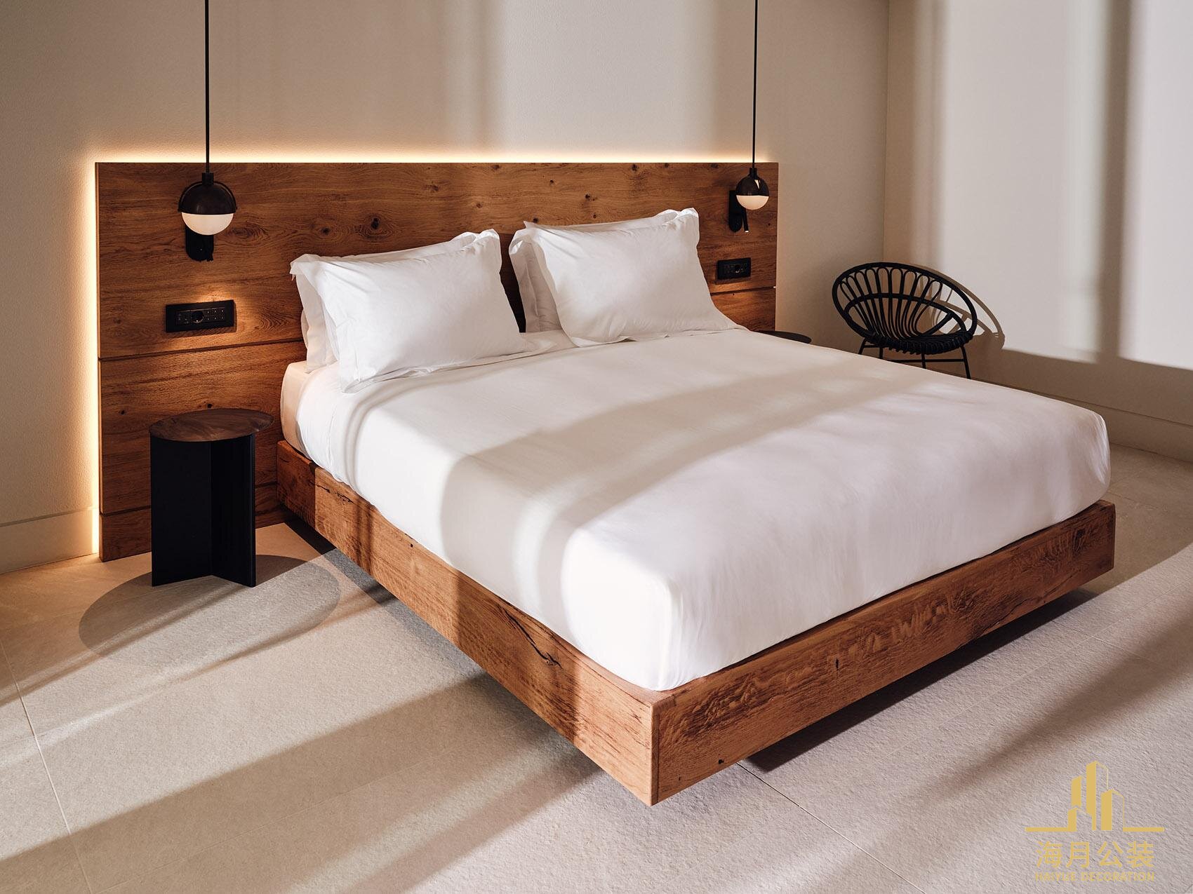 大量采用金堂本地可寻的天然木材,如回收老房屋的木料打造床头板、置物架,保留质朴纹理与岁月痕迹,讲述本土故事;地面选用水泥水磨石,耐用且呈现独特颗粒质感,呼应金堂山水间的石滩、河床元素。同时,融入亚麻窗帘、棉麻抱枕等软装,增添自然触感,就像在客房中,木质床头搭配亚麻质地床品,水磨石地面延伸至阳台,与户外金堂山水景致自然衔接,让游客触摸到自然与人文交融的温度。