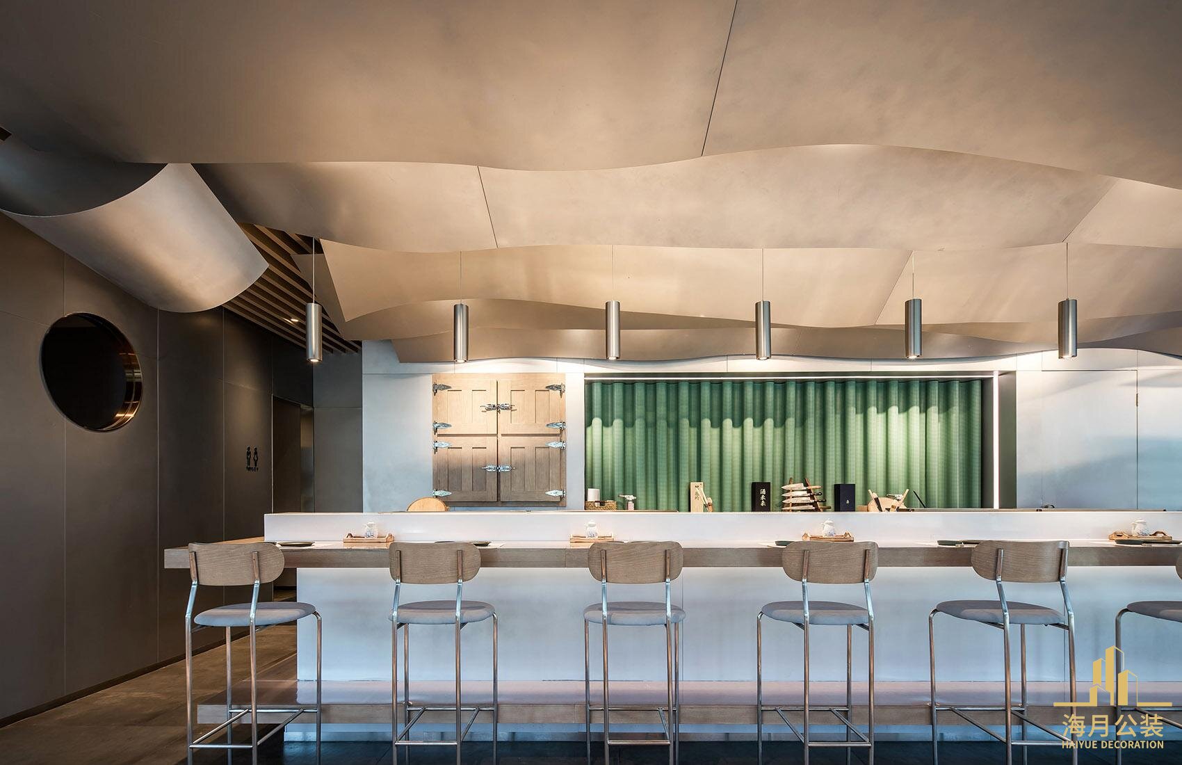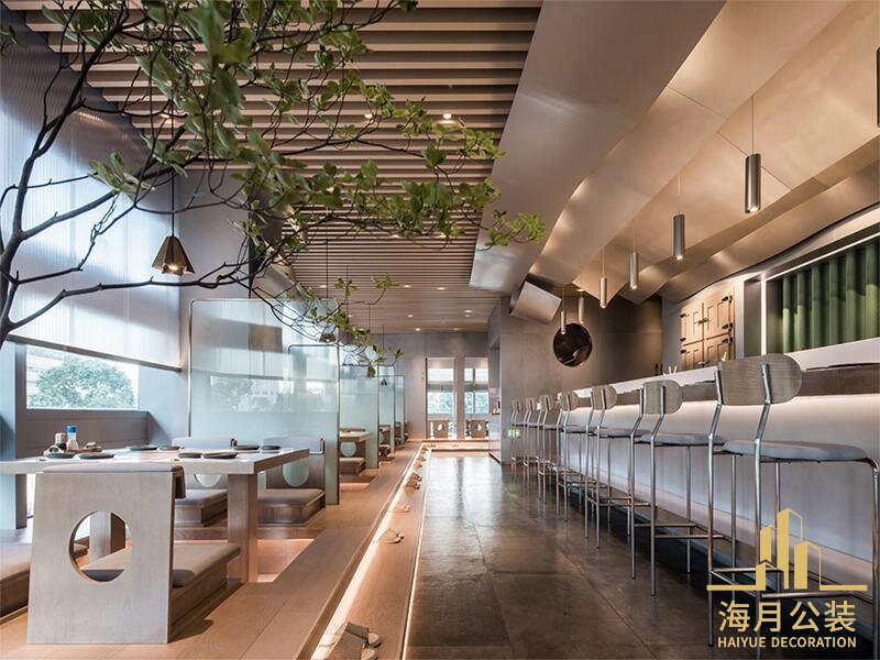 金属与玻璃等现代材质的融入,为空间注入时尚感与精致度。金属材质打造的灯具、桌椅支架,其冷硬的质感与浅木色、灰色形成材质对比,碰撞出独特的美学火花,同时展现出工业风的利落;玻璃隔断的使用,既划分空间又不阻隔视线,保证通透感的同时,增添了空间的现代韵律,使整个日料店在简洁中透出大气与时尚,契合现代都市人