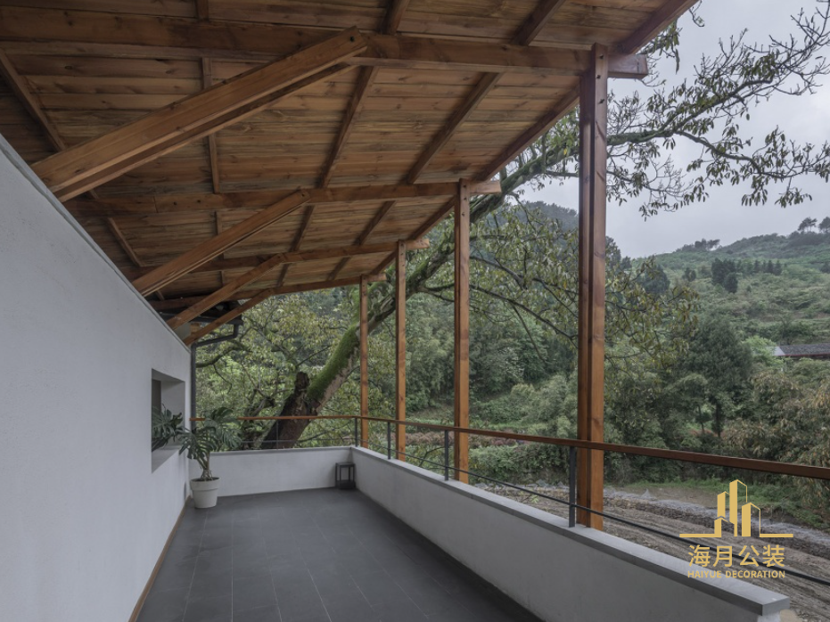 结合开辟出来的庭院,流线到了西侧的尽端,经过最后一个单坡屋檐的压低,穿过一道矮墙之后,视窗被急剧放大,近处的溪流,远处的山体,散散落落的村房。纳入眼底。动线的转折,低处的阴影隐匿,到了高处的阔朗通达,使这里成为身体感知的放大器。