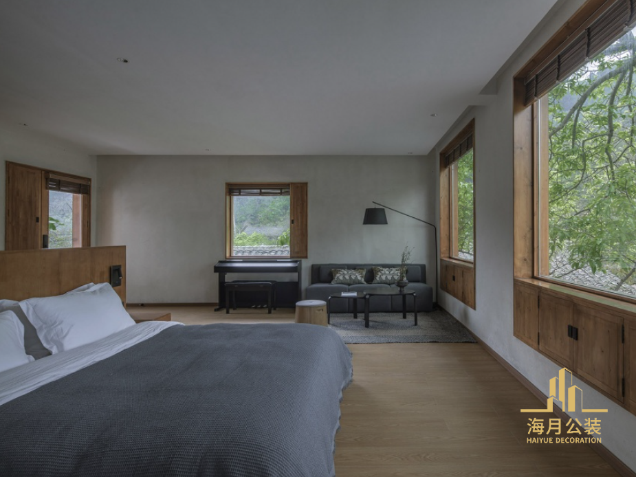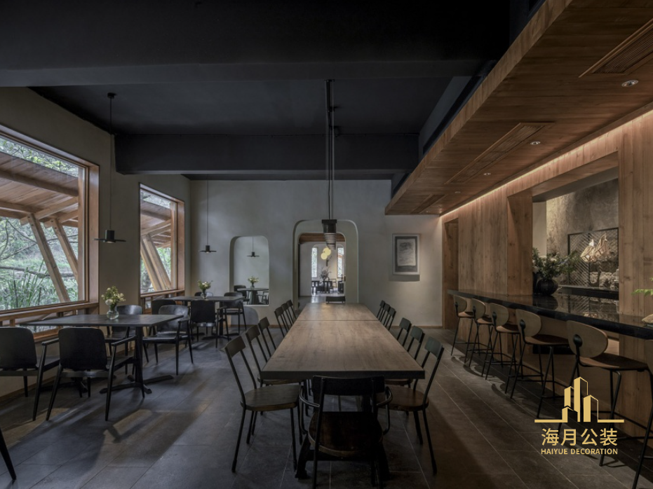 对于公共餐厅及民宿接待,南楼一层将四间教室的横墙适当打通,并在装修设计中进行结构加固,最大化的加强了这里的公共开放性,其中结合运营,公区餐厅亦设有自助式厨房,原有内侧支撑山体的岩廊结构暴露出来,作为自助厨房的背向,而将窗外的水平风景,作为身体的面向。