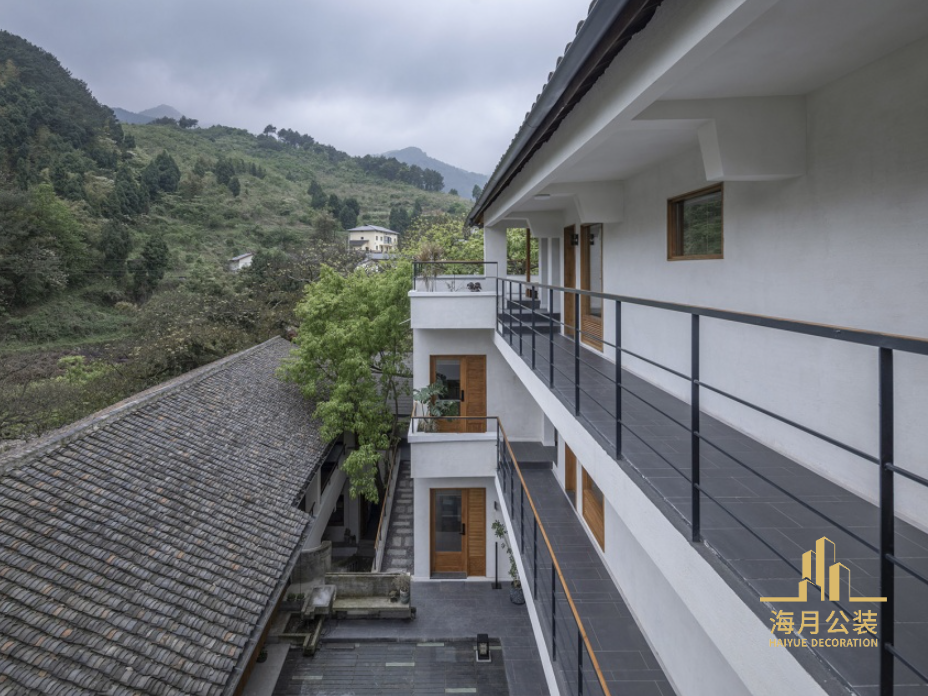 作为动线上节奏转化的重要节点之一,由客房围绕的庭院还得保证一定的隐私性:将两排楼之间的空地为核心,三栋建筑围合起来,塑造一个带有高差,环绕的庭院,通廊将不再孤立,而是庭院的一部分。新的改造在东侧结合高差打通了一个向上的台阶通道。如此,廊道不再是尽端而是可以被环绕。