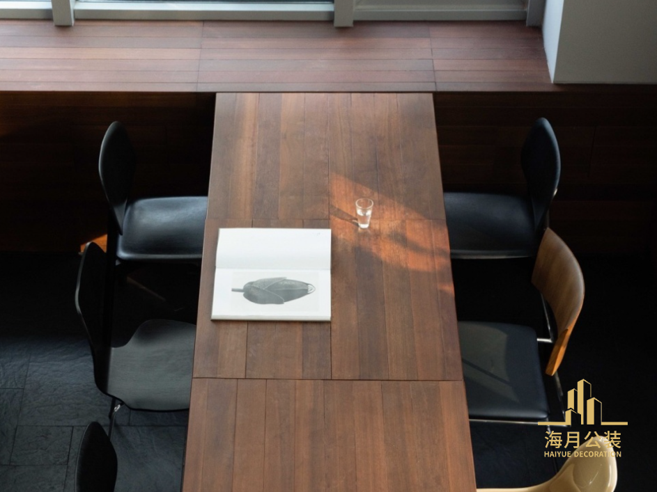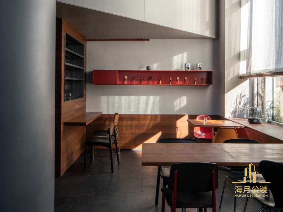 原入户门封堵,留下部透窗,窗外一石,置于户外隔墙夹缝,留有天光上部散入。隙中作景,以破夹道逼仄、幽暗,无趣之题。夹道转身,餐区挑空,高窗、柔光扑面。豁然开朗,别有洞天新世界。也始得见餐厅全貌,方形盒子空间呈对角切分,一半设夹层,一半留空。“赤饭”主理人极爱赤色,也取“赤”、“吃”谐音。我们钢结构及楼梯皆取赤色,结合消防管裸露管道呼应。在整体用材外增一抹浓艳。