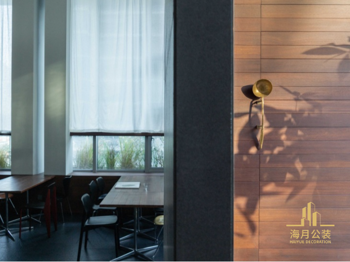 通二层旋梯,在空间设计中设在对角斜线的中点,也是整个方形场地的中心。高区正面闭合,面低区内向开口,外部铁灰,内部赤红,若平静外表下鲜活血肉般的生命激情。夹层为三角形,刚好一半的方形,设为展区。与挑空区有扶栏相隔,西、南两窗光线经棉布窗帘过滤、顶部波浪板反射,漫然内渗。三角夹层不定期陶艺、餐具、手工、绿色食品展览,北向有窗对住宅楼,未免双向互扰,有半透阳光板滤光隔视,沿窗设回收旧木长台以陈展品。餐厅的整个空间都笼罩在滤过的漫射光线中,深色地面的哑光、旧木涂抹过蜂蜡油的暖润、水泥板的清冷银灰、旋梯结构的红色油漆、横窗外的野莽草青,都显得温润质朴,彼此温柔。