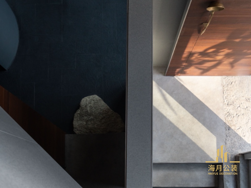 入口部分设内外镜像双生结构,外有悬挑踏步、玄关半墙、钢板雨檐三项围合,内有雨檐、“L”折墙、台阶踏步对仗,引导台阶下行。内外半墙与二层楼板同高,可避入口人行视线,仅见墙内围景。为设定奥旷之意,欲扬先抑之法。