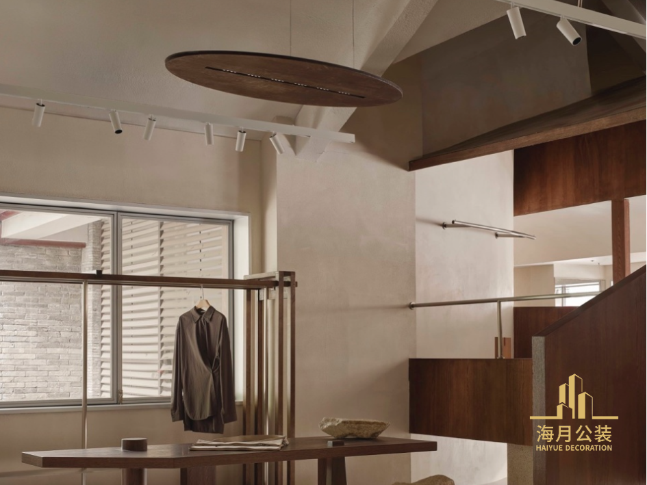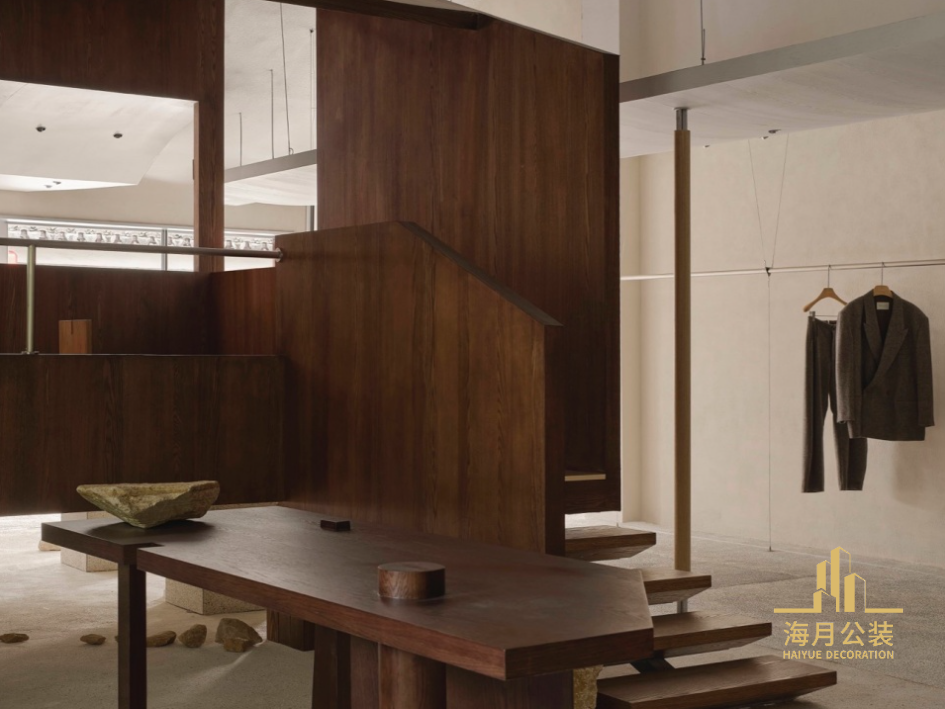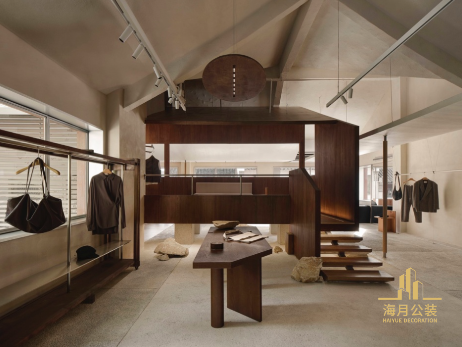 利用坡屋顶带来的高度优势,在平面转角位置盖起一座单坡面木亭,作为业主接待常客友人的休憩区。木亭内部布置如一间茶室,围绕长案设有卡座沙发和几张小椅。木亭正面与背面完全打开,保持了视觉上的通透感。木亭底部由四根矮方柱垫起,整体抬高75公分,由一段悬浮楼梯与地面相连。下方地面采用水洗石,与散落布置的石块共同营造出一个虚构的户外地形。木亭的漂浮细腻与地面的粗粝相对,仿佛它原本不在此处而是从远方流浪而来,只是小作停留。L形转角处放置了一个圆柱体来削弱阳角的尖锐感。其内部分为试衣间和美甲服务区。圆柱体延伸至木亭内部,支撑木亭的山体,与屋顶形成的圆弧交线柔化了空间。木亭与圆柱空间成为空间中最核心的“会客厅”场域,定期邀请核心顾客参与沙龙、分享会或新品试穿会,通过这些互动来增强顾客与品牌之间的黏性。