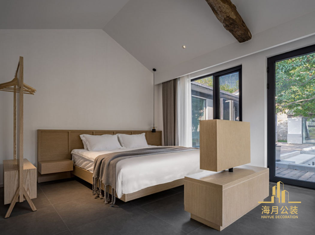 室内装修设计延续了山居小院舒适温暖的格调。我们保留了朴实的色彩基调,和建筑原有的木梁架结构,同时,还有那抹清丽的气质与慵懒的氛围。
