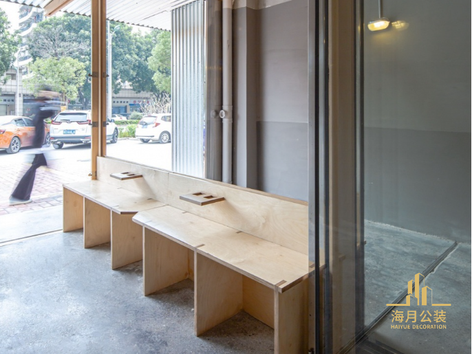 清淡的木色与轻柔悬挂的连续布幔,为社区人们的停留提供温和的体验,同时由于木构架以上的空间被布幔遮挡,适当地减少了建造面积,有效控制造价;入口处在装修设计中考虑内退了约1/3的深度,形成一个半户外遮阴区域,供人们在天气炎热或有雨的季节在室外活动;最外侧的围蔽保留了包租公的不锈钢拉闸门,这种门在珠三角很常见,让新店带着些自然的熟悉感;内部入口的折叠门则可以在天气舒适的时候完全打开,通过木构架的延续性模糊了室内外的边界感,我们希望这种有趣的围蔽切换能给这个空间带来其他的可能。