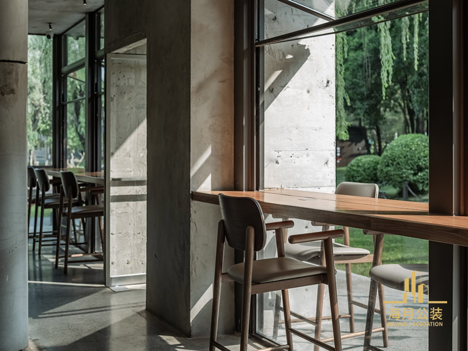 基于“轻改造、弱介入”的改造原则,装修设计保留了原本钢构与玻璃组成的建筑框架。项目基地与公园橡胶跑道仅有数米之隔,时常有晨跑运动的人们来往经过,意味着比邻跑道的建筑立面,有着很强的互动基因。在这个界面,我们选择混凝土浇筑的方式做了局部围挡,混凝土片墙的上部做了手凿处理,产生肌理的变化。之所以选择混凝土,是因为项目周边存在着大量具有年代感的石柱础、拴马桩,不远处的白石桥亦呈现在眼前,我们希望改造后的建筑能够融入这个绿意盎然又历史悠久的遗址公园中,没有显性色彩和质地的混凝土再合适不过。
