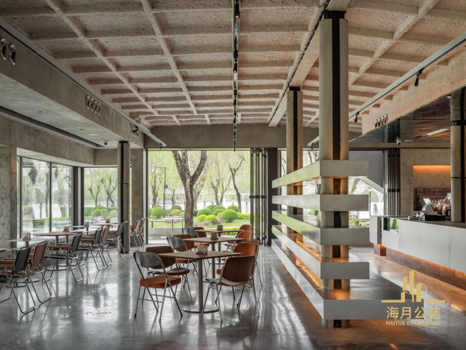 延伸的屋檐对原有树木做出避让,我们希望保留装修设计的善意,在这个公园中,建筑不再单纯地突出自我,甚至连一棵树的生长都不应被打扰。建筑可以在形态和功能上做出调整,但它始终应与自然保持一种和谐的共生关系。室内部分,依循建筑改造的脉络进行空间重塑,遮挡的界面对于空间功能划分起到指引,设计将操作台和卫生间置于遮挡面之后,而基于建筑空间的通透性,空间的设计只需释放窗外景色,使顾客在不同的用餐区域都有可远眺的景色。