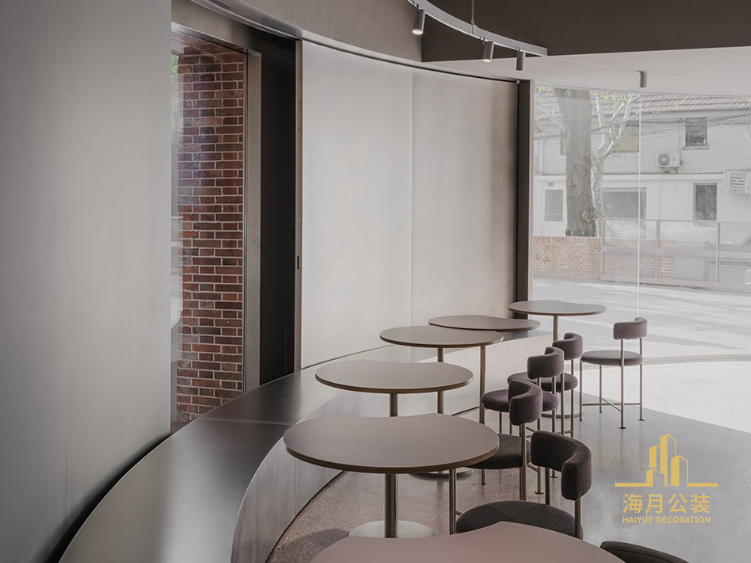 原始建筑入口被室内矩阵和平行于街道的直线切割成尖锐的内嵌直角,两根结构立柱成为进入空间的动线阻隔,我们首要解决的问题就是如何扩增室内空间的净深。通过切割原始立面打开室内空间,嵌入通透的圆形体块创造出宽阔的开放入口。弧形玻璃把更多的自然光线引入室内,增加室内空间深度的同时也与户外空间产生更多的链接。在原始建筑上切割出⼀道门,打破单调留白的立面也成为半独立咖啡空间的入口。