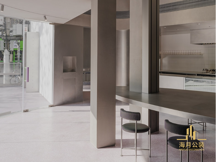 应接不暇的空间设计体验源自于不同类型的工作同时发⽣,也源于组成这个个性独特品牌的个体们。在动线的规划上我们研究了主厨的工作流程,依墙而建的巨大L型厨房不仅理性地规划了厨房动线,同时组织了空间,为厨师团队创造了通透规整的开放式舞台,也让用餐区的食客们有机会近距离观察和体验厨房内分秒必争的紧张氛围。切割后厨不锈钢表皮,嵌入一个发光盒子,为手工意面师和烘焙师创造出一个聚焦舞台。与厨房空间连通着的是半独立咖啡空间,不规整L型吧台延续着主空间布局且与厨房吧台相连,为主餐区输入咖啡血液也预留出更多的活动可能性。