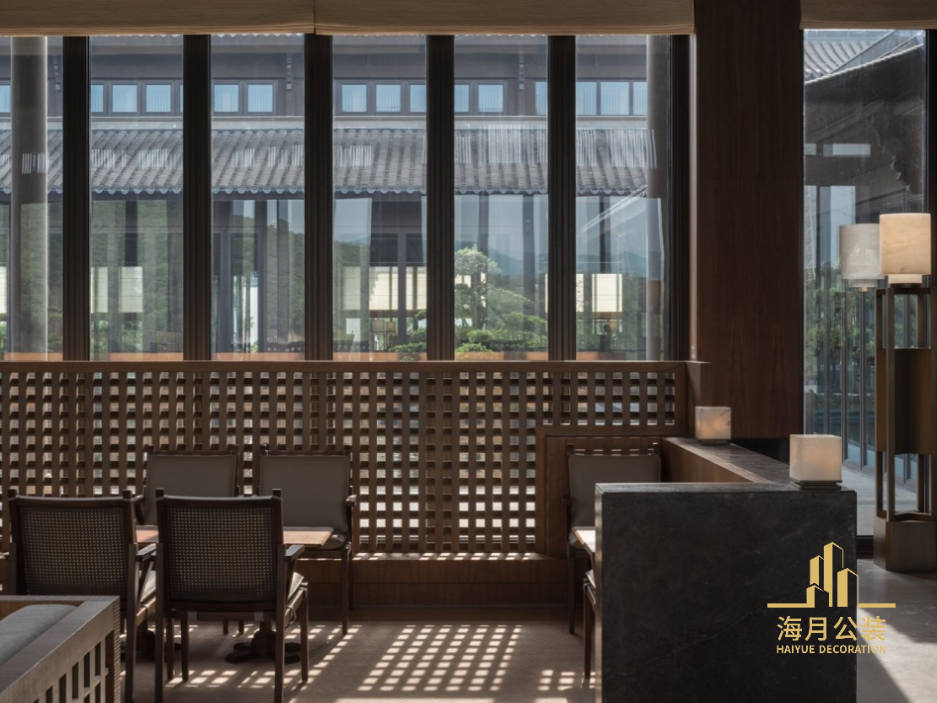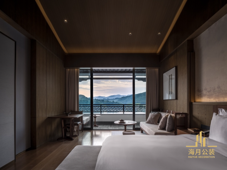 受业主浙江春晖集团及运营方的委托,我们接手为东山大观酒店一案进行室内空间的整体塑造。在介入项目后,我们与酒管方共同探讨酒店方向和后期运营的合理性,参与酒店品牌的共建,达成共同目标与理念认同。针对酒店定位及调性,客群定位,以及成为具有唯一性的目的地型度假酒店。 针对目标客群对精神文化的需求,如何在有限的时间内,尊重建筑原有形制的同时,寻求在地文化与现代美学之间的平衡,成为设计团队在装修设计中亟待解决的问题。谢灵运描写东山山野生活的《山居赋》成为联系古今生活方式的纽带,赋中“去饰取素,傥值其心耳”,意为 “去掉修饰的,不加以雕琢,只有最本质纯粹的,才最接近本心”。和项目定位的核心理念穿越千年不谋而合,也成为设计团队设计的核心方向。 “去饰取素”的呈现,演变为由节奏引发的情绪共鸣。从建筑与室内的纯粹性、内外景致的连续性、家具系统与物件的秩序性,探究人与物、物与空间、空间与环境之间的共生关系。边界即介质。当人的视线落位在公共区域——酒店大堂,建筑以古典园林四合院之态对称划分。临湖的大堂吧,以跃层高挑的中庭结构,延伸着空间立面的舒展与张力。通过装修设计在包裹与敞开的围合之间,满足功能与审美的需求。延续建筑关系,形成南北对称的功能区域,南为酒吧区,北为下午茶区,铺就平和温善的情绪氛围。自然光成为连接内外的媒介,洒下的斑驳阳光穿跃至格栅化的玻璃木窗,描绘着万物生长。四季花艺置于南北之间的中央区域,模数化的内在体块融合、穿插、分隔与叠加,使得室内空间趋于“化零为整”,连同阵列的方体灯构成内外光景的统一。让景于山湖,赏山水风光。 客房沿湖而建、面湖而居,质朴之感与公共区域一脉相承。在装修设计中选用来自本地古代官服的刺绣织布挂画,赋予空间纯粹的艺术感。清雅木质联结东山的自然诗境,化为隐于山野的自在闲适。三角、圆的几何秩序与数字的模数关系,以点线的布局、沉稳的色彩、简洁的造型、考究的细节与竹、藤、木、皮等天然的材质,呈现家具系统与物件的秩序性,可见设计团队对传统历史文化的挖掘与转化。