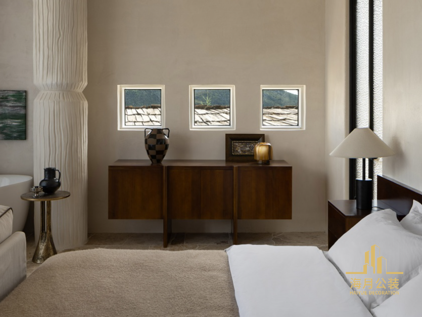 这里是古茶马古道的途径点,大堂是在原有的院子里面加建的,和半开放的过厅连在一起,通过装修设计结合本地回收的石头,松木板等材料做出了一个歇马饮茶的空间。建筑场地空间有限,几乎三面都是和邻居接壤,通道开窗是恰到好处的避免相互打扰,但是把外的旧有面貌呈现在过道之中。人的游走代替了云的飘忽,通过云的变化的的间隙透出去看到外面的一隅,就像装修设计中室内的开窗恰到好处的把外面的部分景观和室内做好了融合。楼顶做了20平米左右的预约制私房餐厅,在靠近大佛寺的同时俯瞰整个古城。