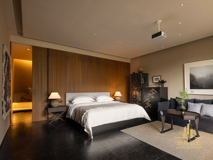 空间设计充分挖掘在地人文与地域特色,从建筑到室内,回归自然质朴,在这个百年老村落里,修建了一处避世安静的疗愈之地。巍巍太行,清洗凡尘俗事,太行山犹如一幅长卷铺陈开来,一间什么样的酒店可以让人忘记岁月,忘记喧嚣,只享受当下这一刻的悠长。酒店定位为美学文化度假酒店,结合当地特色,输出淳朴自然的生活与度假方式,装修设计上就地取材,以当地的石板岩为材料,作为屋顶、地面,专门定制的软装家具,材质细腻,延续了酒店一直秉持的度假生活。设计上以减少硬装,重视软装为原则。室内墙面用肌理漆,触感粗糙自然。可活动的定制家具、摆件填充空间,让客房如家一般,自由松弛。