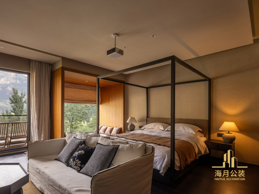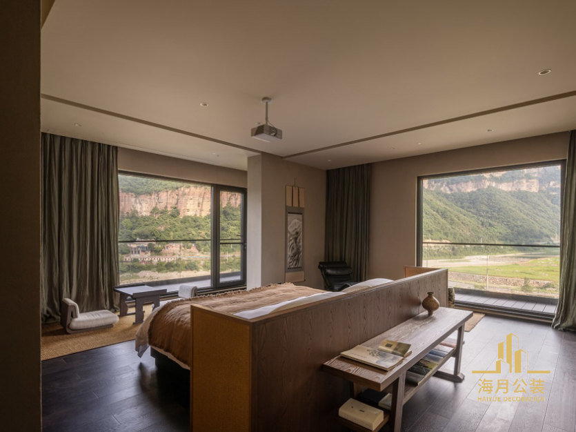 餐厅取作“入云坪”,两面落地玻璃可以近距离感受太行扑面而来的气势,我们没有用隔断分开吧台和就餐区,让视野和动线都是自由方便的。客房的装修设计理念延续“回归自然质朴”,以家具、以尺度,以细节完成一场纯粹的安静。家具,是空间情绪的表达。根据酒店气质定制的软装家具,温润厚重;柔软的窗帘有自然的褶皱,微透的光给空间增添一份朦胧,不做过多的装饰,希望可以让自然包裹你,让自然治愈你。夏日听蝉鸣鸟叫,躲进自在的山野避暑,冬日围炉而坐,看窗外大雪纷飞的浪漫。这里离城市很远,离自然、离内心很近。檐廊听雨,品茶闻香,以诗意的美学享受度假生活。
