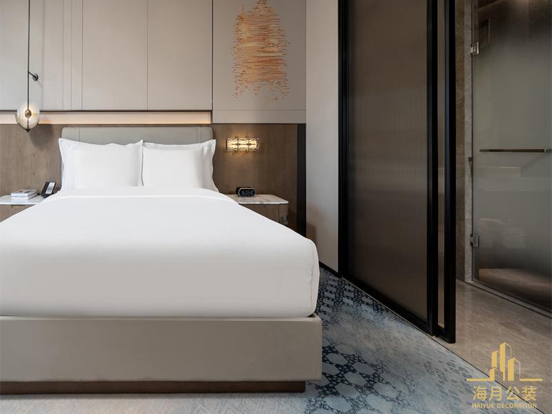 客房作为住客休憩的核心区域,工装设计聚焦于空间的利用与居住的舒适性。整体设计简洁大方,摒弃了冗余的装饰,采用柔和的色调,如米白、浅棕等,营造出温馨放松的休憩氛围。床品选用顶级材质,触感柔软丝滑,搭配质感良好的实木家具,每一处细节都彰显着品质。客房内的设施布局合理,兼顾了实用性与美观性,工作区、休憩区、卫浴区划分清晰又相互关联。玻璃隔断的设计是一大亮点,它既增强了空间的通透感与现代感,又能在必要时保证区域的私密性,让住客在客房内也能感受到开阔的空间体验,仿佛将成都的开阔天空与闲适生活搬进了室内。